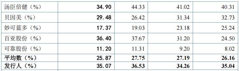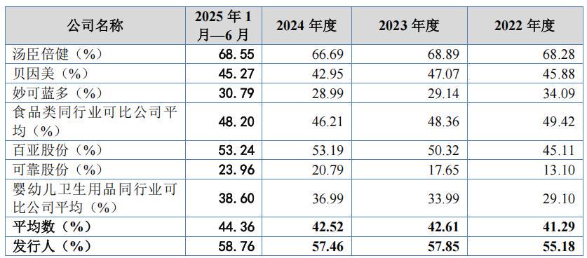 报告期各期,英氏控股主营业务毛利率分别为55.10%、57.81%、57.38%和58.68%,高于可比同行均值41.29%、42.61%、42.52%和44.36%。