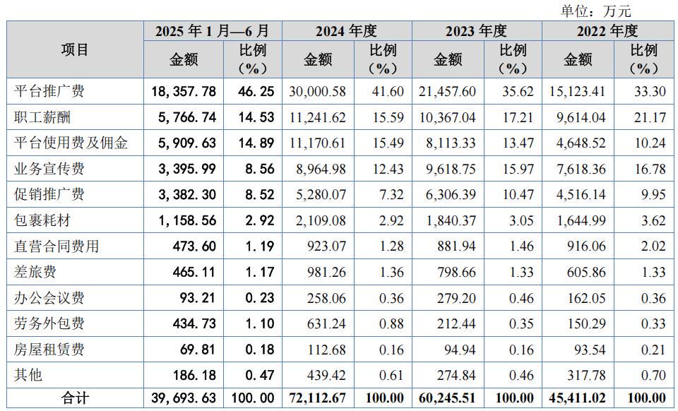 促销推广费用、包裹耗材等组成。公司平台推广费主要为在天猫、京东、抖音等电商平台使用万相台、京准通、巨量千川等推广工具产生的支出。报告期各期,公司平台推广费分别为1.512亿元、2.146亿元、3亿元和1.836亿元,增速较快。