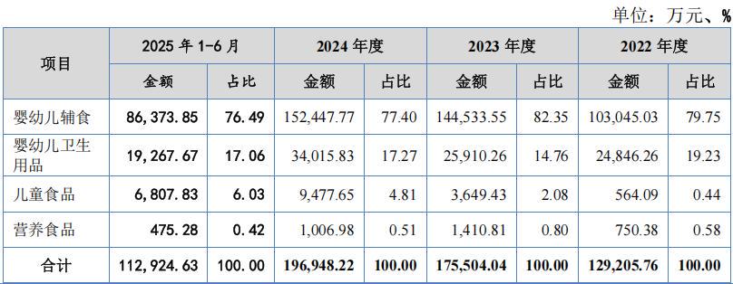 英氏控股是一家集婴幼儿辅食、婴幼儿卫生用品、儿童食品和营养食品的研发、生产和销售业务为一体的企业。2022年-2025年1-6月,公司营业收入分别为12.961亿元、17.583亿元、19.743亿元和11.317亿元,净利润分别为1.17亿元、2.195亿元、2.101亿元和1.526亿元。2024年度及2025年第一季度公司婴幼儿辅食收入增长减缓,其他产品收入增长较快,但体量较小、竞争激烈,2024年公司出现了反降利的情况。