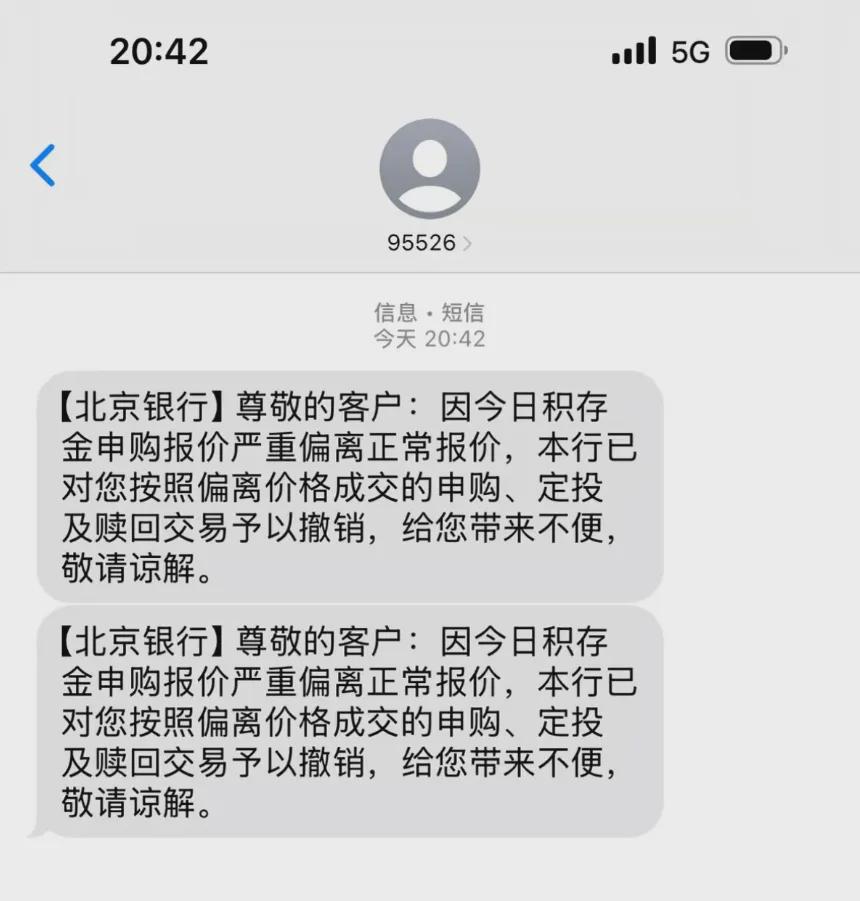 3月2日晚间,北京银行撤销了用户以1.6元/g申购积存金的交易。有用户收到北京银行发送的短信通知,称因今日积存金申购报价严重偏离正常报价,本行已对您按照偏离价格成交的申购、定投及赎回交易予以撤销,给您带来不便,敬请谅解。另有用户反映,此前购买积存金的资金以“冲正”的名义,被重新转回了自己的储蓄卡。