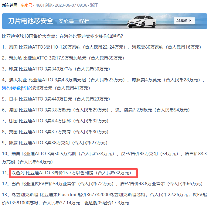 以2023年为例,当时 ATTO 3在以色列的售价为15.7万以色列镑,约32万人民币,是 元PLUS在国内价格的两倍。