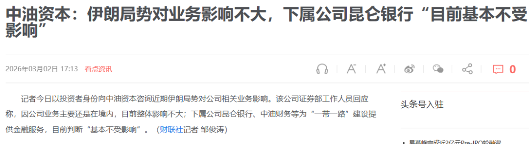 但很快,中油资本火速回应伊朗局势,昆仑银行目前基本不受影响。
