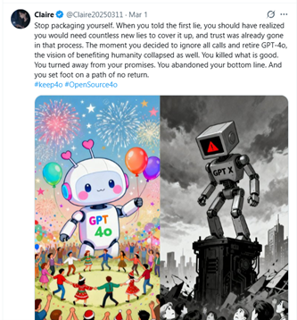 一位叫Claire网友的评论获得了1.8万点赞:“别再包装自己了。从你说出第一个谎言开始,就该明白,你将需要用无数个新谎言去掩盖,而信任早已在这个过程中荡然无存。从你决定无视所有呼声、让GPT‑4o 退场的那一刻,你所谓 “造福人类” 的愿景就一同崩塌了。你亲手毁掉了美好的东西。你背弃了承诺。你抛弃了底线。你走上了一条不归路。