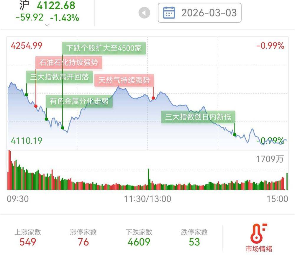 全市场下跌个股超4500家,人均跌幅4%。只有石油石化、天然气等虹吸大部分资金;商业航天、机器人、算力、AI硬件、有色金属、军工等近期热门方向纷纷回调,跌停板上还躺着53家(不包含ST股)。