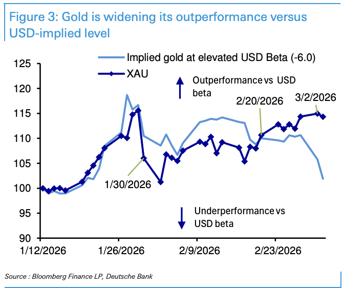 相较于危机溢价这一不稳定变量,德意志银行认为,当前黄金存在更为扎实的做多依据——上周出现的相对美元隐含金价的正向偏离,正在进一步扩大。