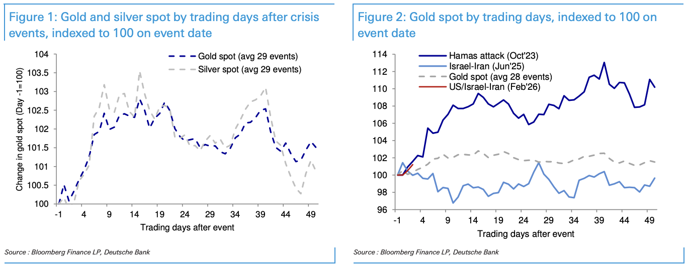 据追风交易台,德银2026年3月3日发布报告《黄金变化的危机溢价》,报告指出,黄金对地缘政治危机的反应存在高度不确定性,平均而言确实正向,但个体事件分散度极大,投资者切忌将"危机必推金价"视为铁律。