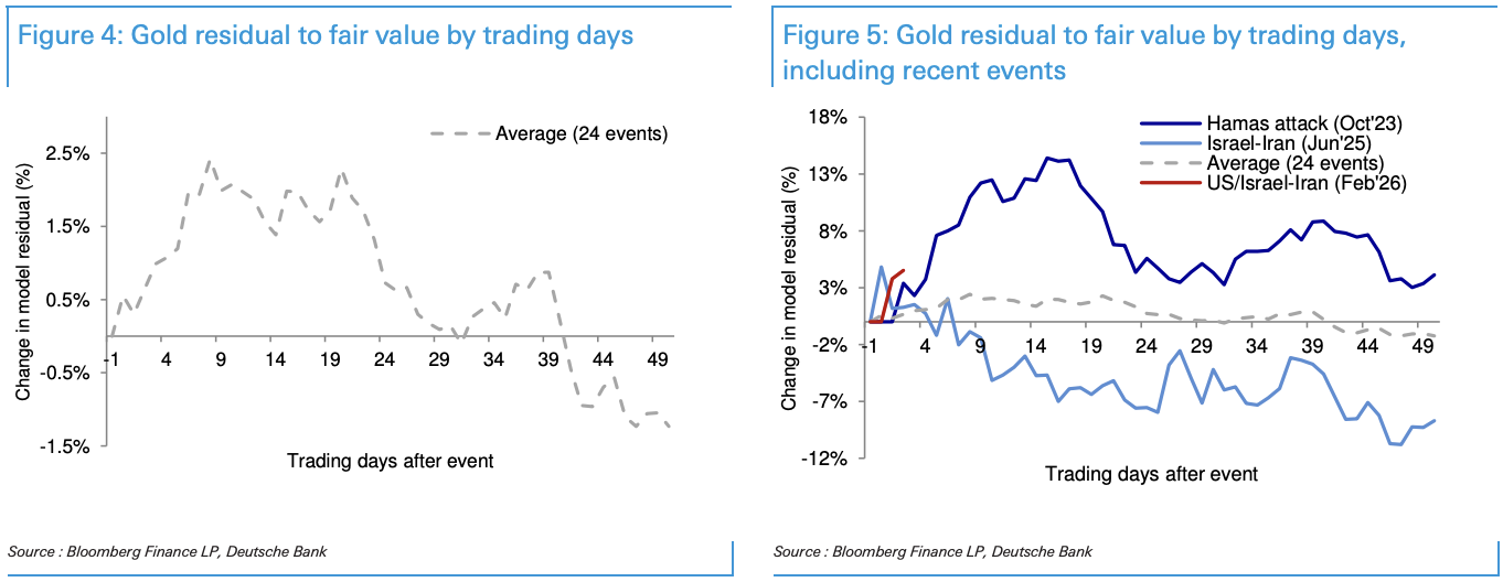 为了剥离危机情绪对金价的直接冲击,德银研究团队还对黄金相对公允价值模型的残差进行了分析。即在排除美元、利率等传统驱动因素后,单纯评估危机带来的额外溢价。
