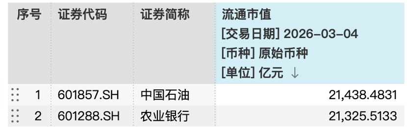 4日早盘,“三桶油”集体大幅下挫,中国石化(600028.SH)一度触及跌停,中国石油(601857.SH)跌超9.5%,中国海油(600938.SH)跌幅亦超过8%。然而截至收盘,三家公司悉数上涨,中国石油由跌转涨,收报13.24元/股,上涨0.68%,按照证券指定交易日收盘价*截至日该证券的发行上市股数计算,该股A股总市值升至2.1438万亿元,正式超越农业银行(601288.SH),成为A股市值新王。中国海油和中国石化则分别收跌1.29%和5.37%。