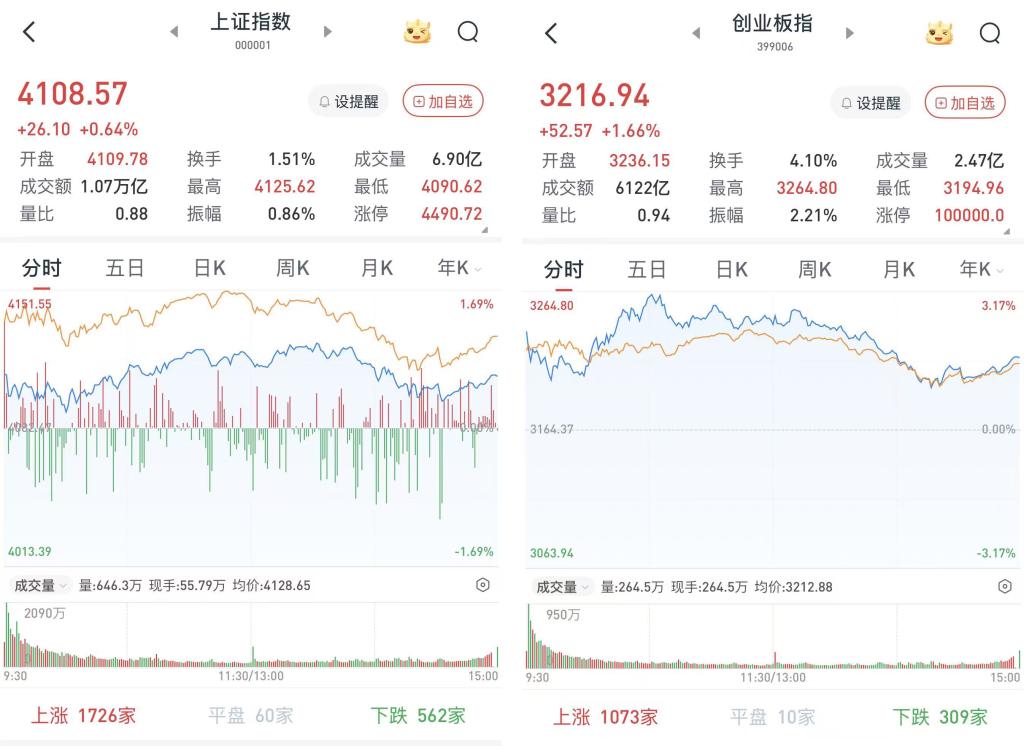 至收盘,上证综指涨0.64%,报4108.57点;科创50指数涨1.72%,报1405.35点;深证成指涨1.23%,报14088.84点;创业板指涨1.66%,报3216.94点。