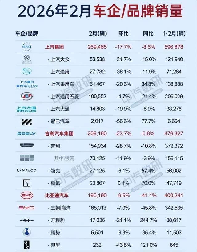 而根据行业公开销量数据,2026年2月比亚迪整体销量出现明显下滑,19万辆的成绩位列车企销量榜第三,环比下降9.5%,同比下降41.1%,属于比亚迪近年来为数不多月销跌破20万的时刻。
