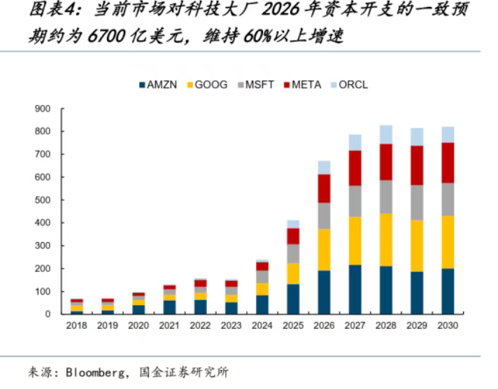 根据各大科技巨头近期披露的财报指引和分析师预测,仅2026 年一年,亚马逊(约 2000 亿美元)、Alphabet(约 1850 亿美元)、Meta(约 1350 亿美元)、微软(约 1050 亿美元)和甲骨文(约 500 亿美元)五家巨头,就会将近 7000 亿美元的现金流或债务融资,疯狂投向 AI 基建。