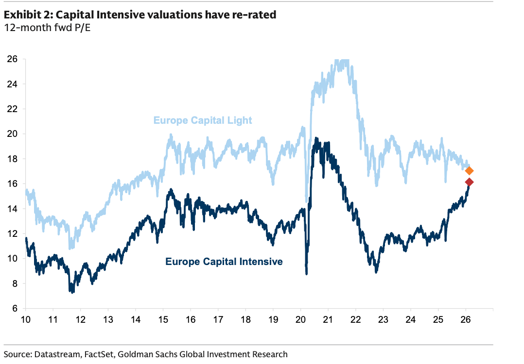 高盛在关于 HALO 资产的研究报告里,以欧洲市场为样本,发现过去享受估值溢价的轻资产组合,正在遭遇估值回调,而估值长期被压制的重资产组合却持续提升,尤其是在过去几年的时间里,两者之间的估值差急剧收敛。