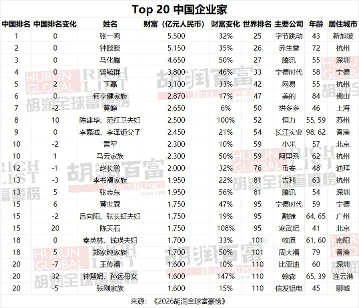 中国榜单看点十足,字节跳动张一鸣以5500亿元财富登顶中国首富,钟睒睒、马化腾分列二三位,雷军、马云家族并列第十。值得一提的是,中国白手起家富豪占比高达90%,远高于全球69%的平均水平,31岁的霸王茶姬创始人张俊杰,以85亿元财富成为中国最年轻白手起家十亿美金富豪,全球超七成白手起家女企业家也来自中国。