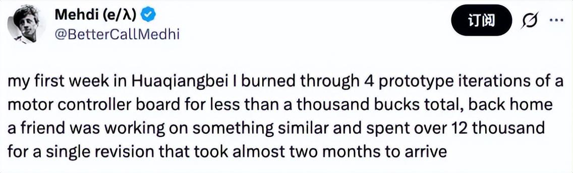 他分享了一个具体案例:在华强北,他一周内就完成了一块电机控制板的4次原型迭代,总成本不到一千美元。而在他欧洲的老家,一个朋友做类似的项目,光一次修改就花了一万两千多美元,还等了将近两个月。
