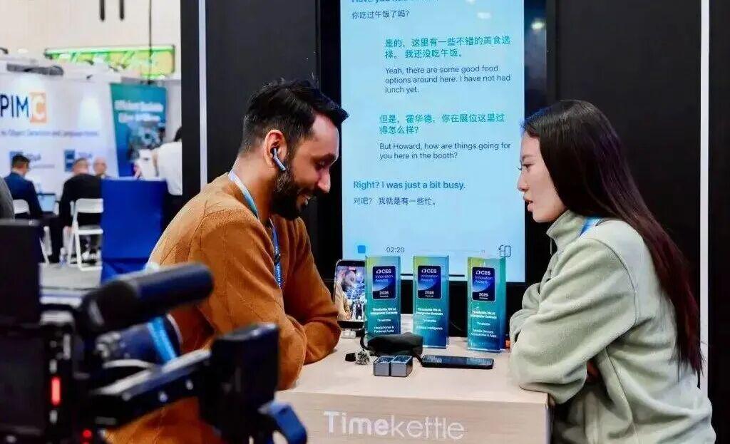 时空壶首次参展便引人注目,其W4 PRO AI同传耳机支持3秒延迟的双人实时对话翻译,在嘈杂的展馆中演示效果惊人。