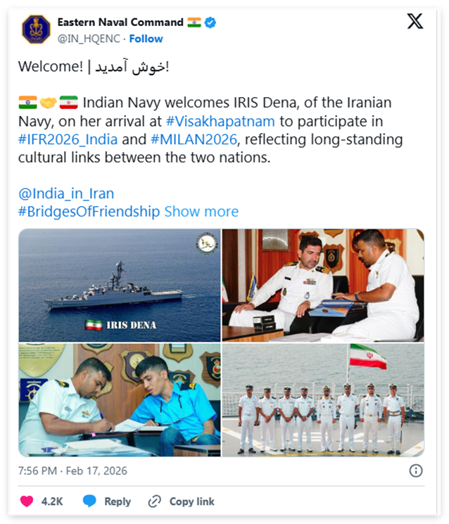 后来看报道知道,这艘伊朗军舰,是应印度之邀去做客的,参加了两场印度海军活动:一场是代号“米兰”的多国海军联合演习和联欢活动,另一场则是2026印度国际阅舰式活动。