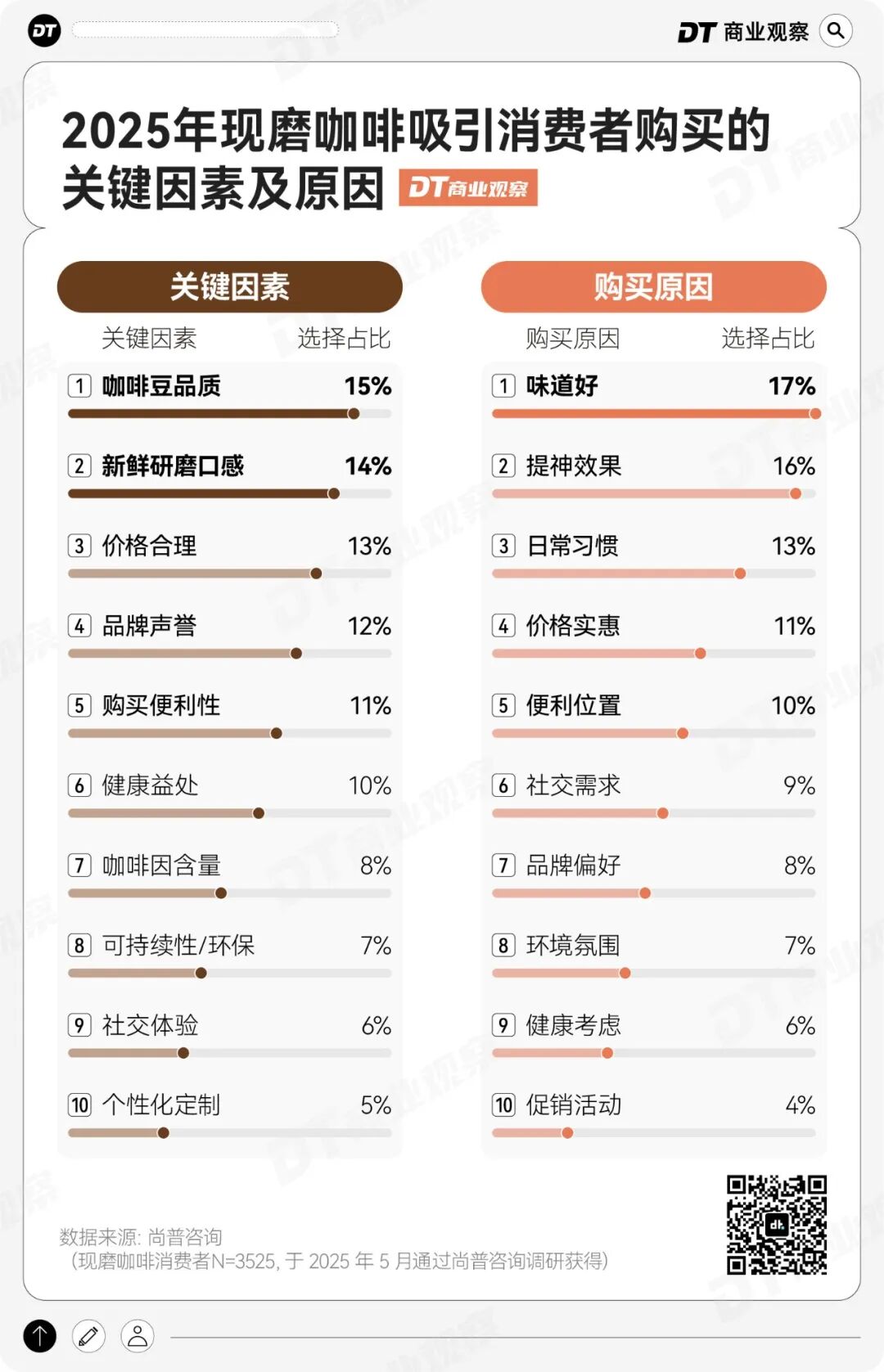 另一部分消费者则开始向“品质”靠拢。尚普咨询调研数据显示,消费者选择现磨咖啡的首要原因是口感体验(43%),其次是提神醒脑的功能性需求(40%);促销与营销因素的影响相对较低。这意味着,当咖啡成为人们的日常高频消费选择后,产品本身的风味表达正在成为决策关键。