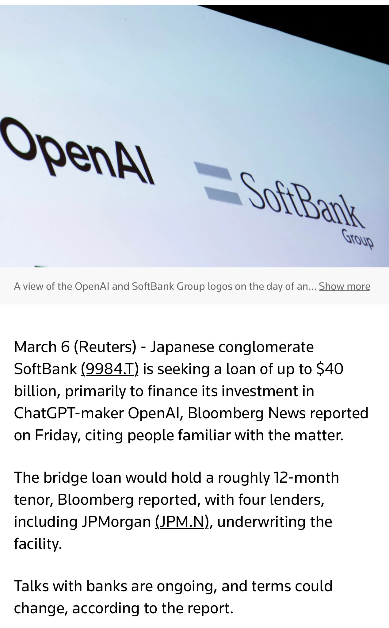 3月6日,多家媒体援引知情人士消息称,日本科技投资巨头软银集团正寻求一笔最高达400亿美元的贷款融资,主要用于扩大其对人工智能公司OpenAI的投资。如果交易达成,这将成为软银历史上规模最大的美元计价借款。