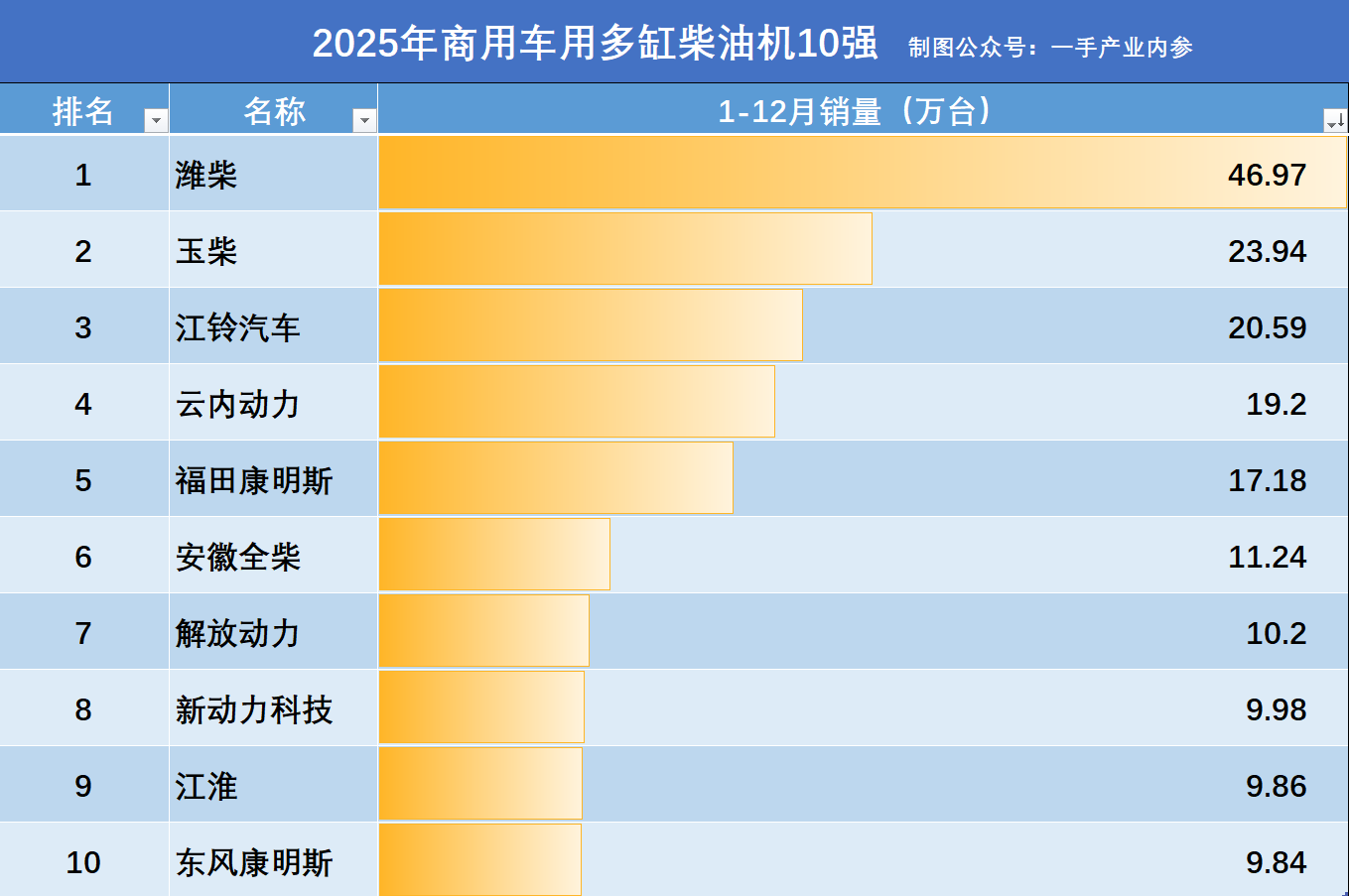 另附:2025年1-12月我国商用车用多缸柴油机销量10强,数据源于:中国内燃机协会。