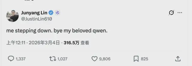 2026年3月4日凌晨,一条只有十几个英文字的推文,直接刷爆了整个科技圈——阿里通义千问的技术负责人林俊旸,在社交平台写下“me stepping down. bye my beloved qwen”,官宣卸任这个自己一手带大的项目。