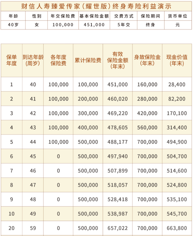 根据利益演示,假设40岁女性年交10万、交5年,共50万元,前5年的现金价值都是要低于已交保费的,6年后退保才能不亏。10年后现金价值54.57万元,年化收益率不足1.2%。单从投资角度来看,收益并不高。此外,被保险人身故保险金给付比例根据年龄不同在120%-160%之间,但未提供全残保障。总体来看,这类产品短期内退保存在本金损失,即便在5-10年内退保收益率也不会很高,适合长期持有。
