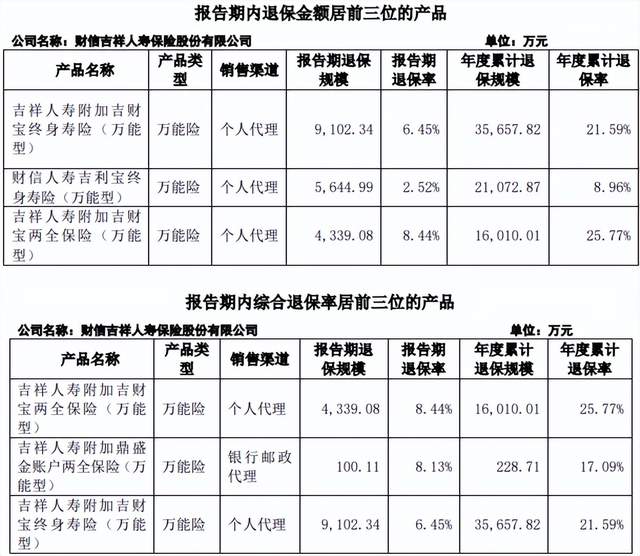 不仅是分红险,万能险业务也在收缩。近几年,财信人寿退保金额和退保率前三榜单长期被万能险占据。2025年公司综合退保率为3%,在57家寿险公司中排在第8位。在退保金额方面,吉祥人寿附加吉财宝终身寿险(万能险)以3.57亿元的退保金额排在首位;在退保率方面,吉祥人寿附加吉财宝两全保险(万能型)以25.77%的退保率排在首位。