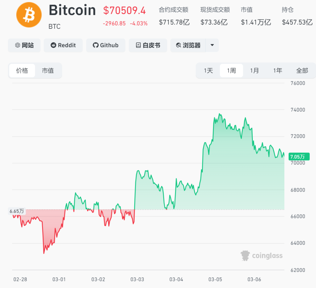 2月28日,中东局势恶化的消息发酵,比特币于盘中大幅下挫,接连跌破65000美元、64000美元两道关口;短短数日后,3月5日,比特币价格又强势反弹,一度接近74000美元。CoinGlass数据显示,以该周的最高最低点计算,比特币的振幅高达10477美元。