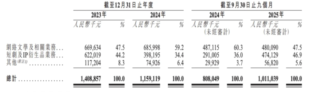 招股书披露的财务数据显示,2023年、2024年及2025年前9个月,中文在线的收入分别为14.08亿元、11.59亿元及10.11亿元。其中,网络文学及相关业务的收入分别为6.69亿元、6.85亿元、4.8亿元,占比分别为47.5%、59.2%及47.5%。短剧及IP衍生品业务的收入分别为6.22亿元、3.98亿元、4.74亿元,占比分别为44.2%、34.4%、46.9%。