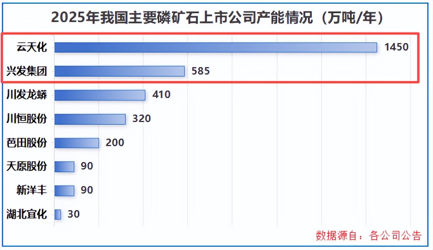 云天化就是我国最大的磷矿石生产企业,手里握着1450万吨的磷矿石年产能;兴发集团也不逊色,磷矿石年设计产能有585万吨,在国内仅次于云天化。