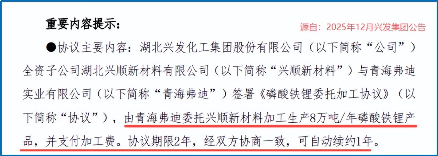 2025年12月,兴发集团子公司兴顺新材料与青海弗迪(比亚迪全资孙公司)签署磷酸铁锂委托加工协议,为青海弗迪加工生产8万吨/年磷酸铁锂产品。