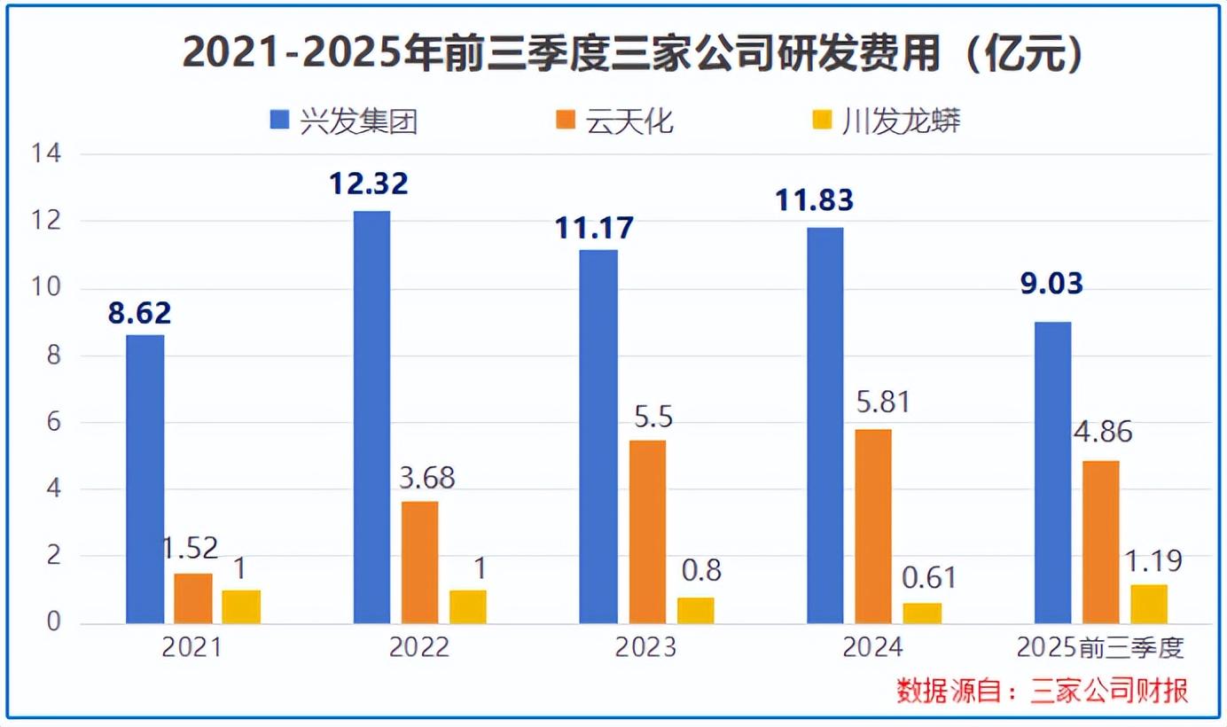 在这一点上,兴发集团看得很透彻,并且早早投入研发以构筑技术壁垒。2021-2025年前三季度其研发费用累计达到52.97亿元,比云天化、川发龙蟒等同行都要高出不少。