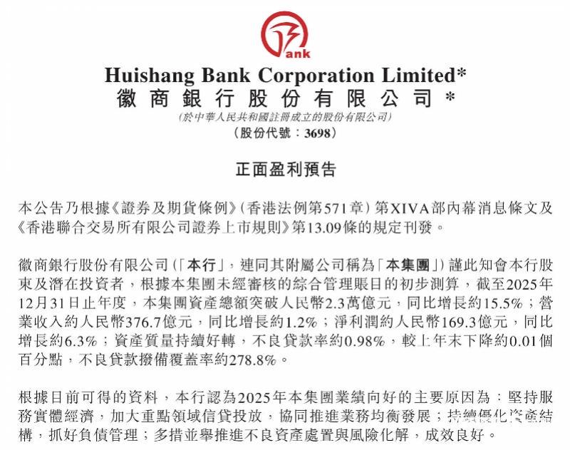 徽商银行强调,以上数据为初步测算,实际业绩或存差异,详细信息将于2026年3月底前发布的年度业绩公告中披露。