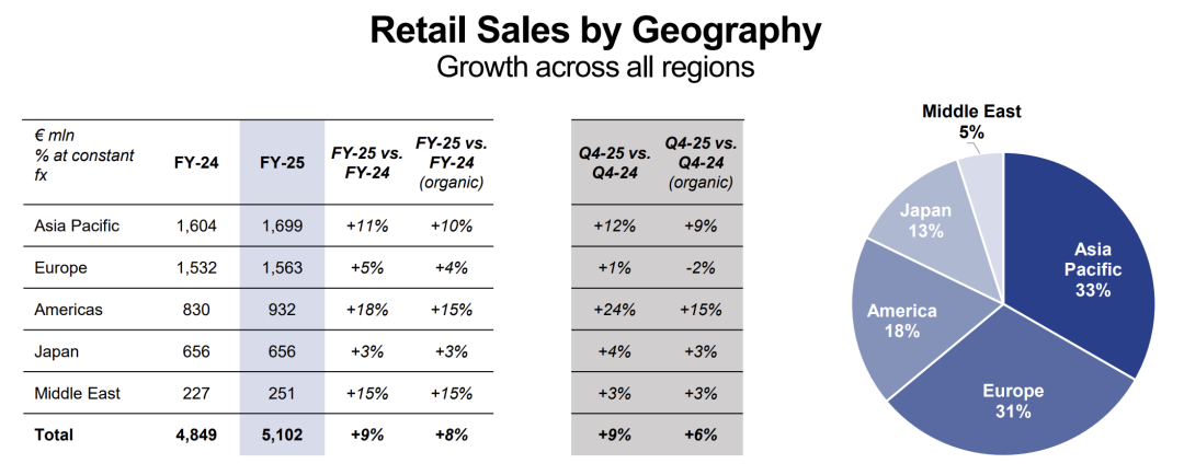 分市场来看,该集团在全球各地区零售销售净额均实现正增长,包括中国市场的亚太地区增长10.9%至17亿欧元,占总零售比的33%,仍然是集团最大收入来源;欧洲地区增长4.7%至15.6亿欧元,占比31%;美洲地区增长17.7%至9.32亿欧元,是增长幅度最高的市场,占比18%;日本地区增长3.1%至6.5亿欧元,占比13%;中东地区增长15.5%至2.5亿欧元,占比5%。