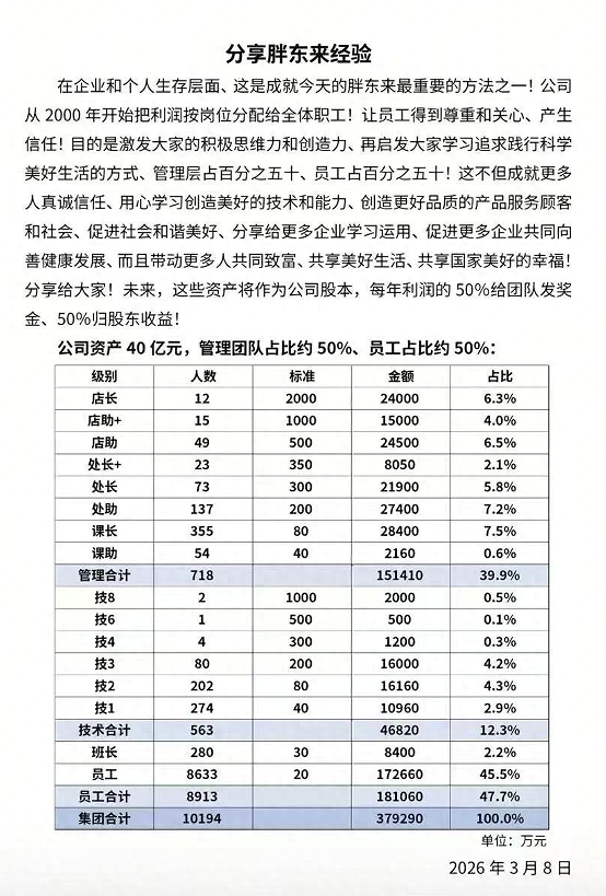 胖东来资产为379290万元,店长2000万元,占比就是0.53%。普通员工20万元,占比就是0.0053%。于东来之前说2025年胖东来净利润估计15亿元左右,一半分给团队就是7.5亿元,那一个店长一年就可以分到397.5万元,一个普通员工可以分到3.975万元。