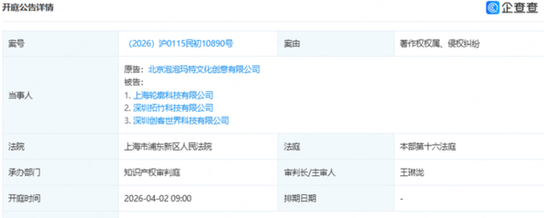据报道,4月2日泡泡玛特诉拓竹科技案将开庭。