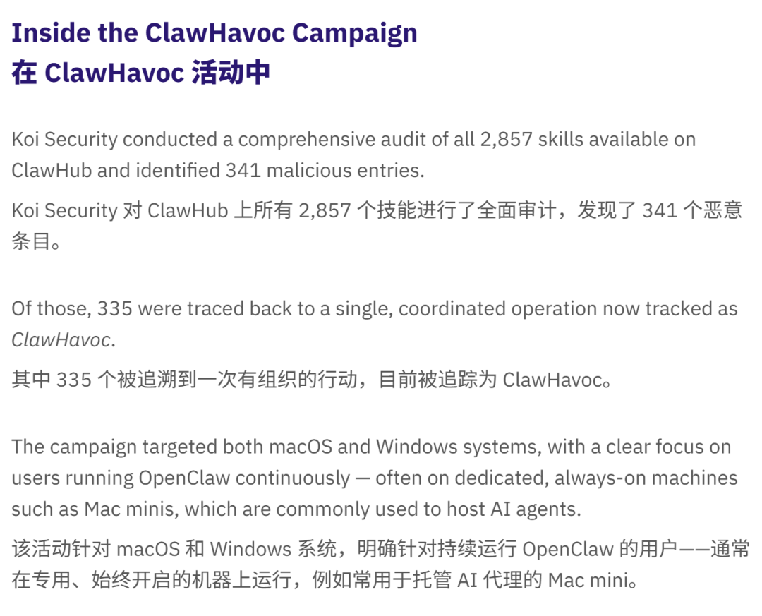 网络安全公司 Koi Security 研究了一下,他们在龙虾的应用市场里审查了 2857 个 Skills,结果发现其中超过 10% 的 Skills 都有问题