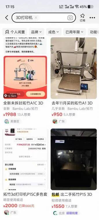最直观的就是二手市场的数据。原价2300元左右的拓竹P1系列在闲鱼跌至1900元左右;被时代抛弃的第一代3D打印机,更是当废铁卖,售价集中在四五百元,却依然乏人问津。