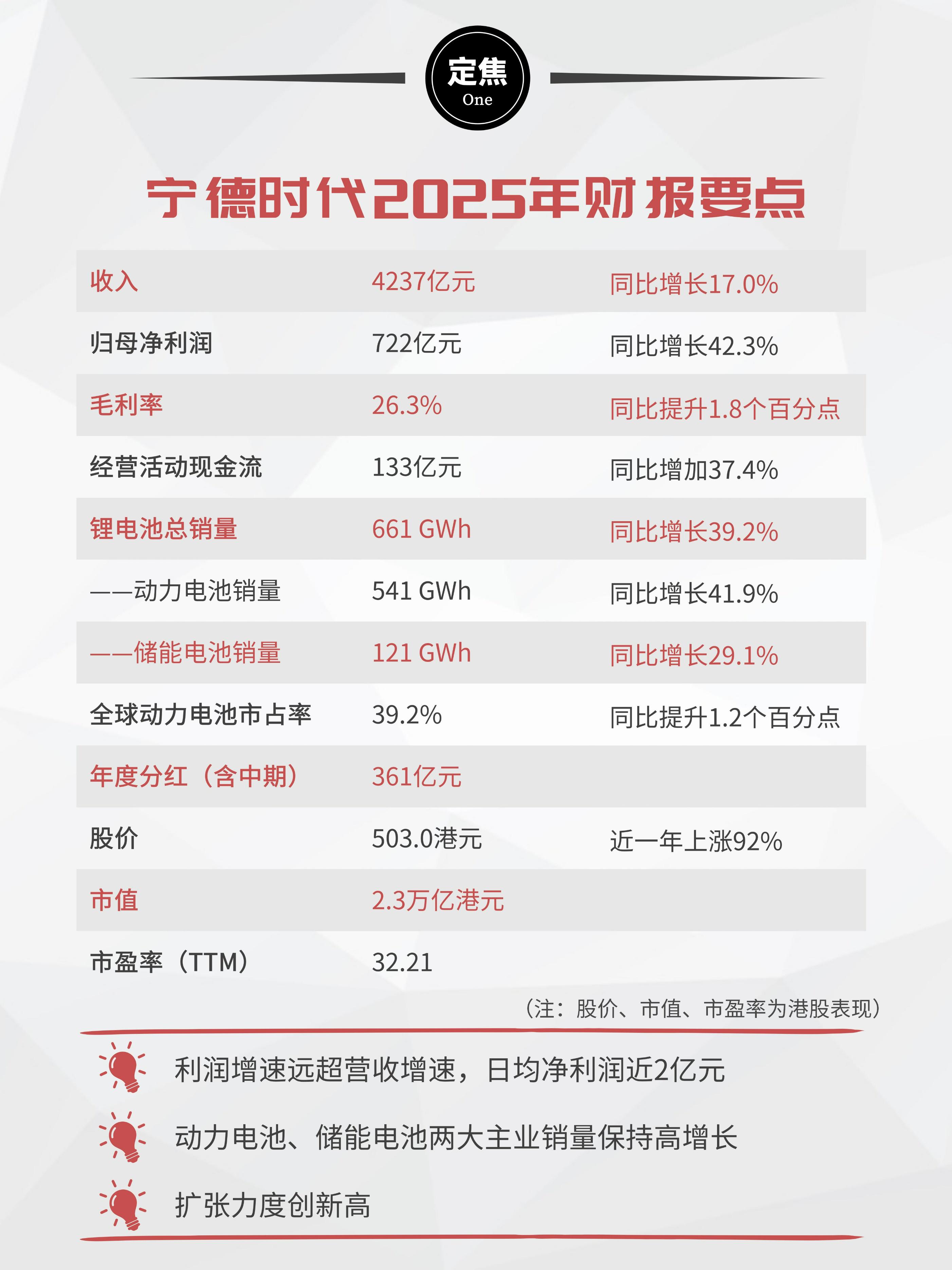 3月9日,宁德时代公布了2025年财报:营收4237亿元,同比增长17%;归母净利润722亿元,同比大增42%。