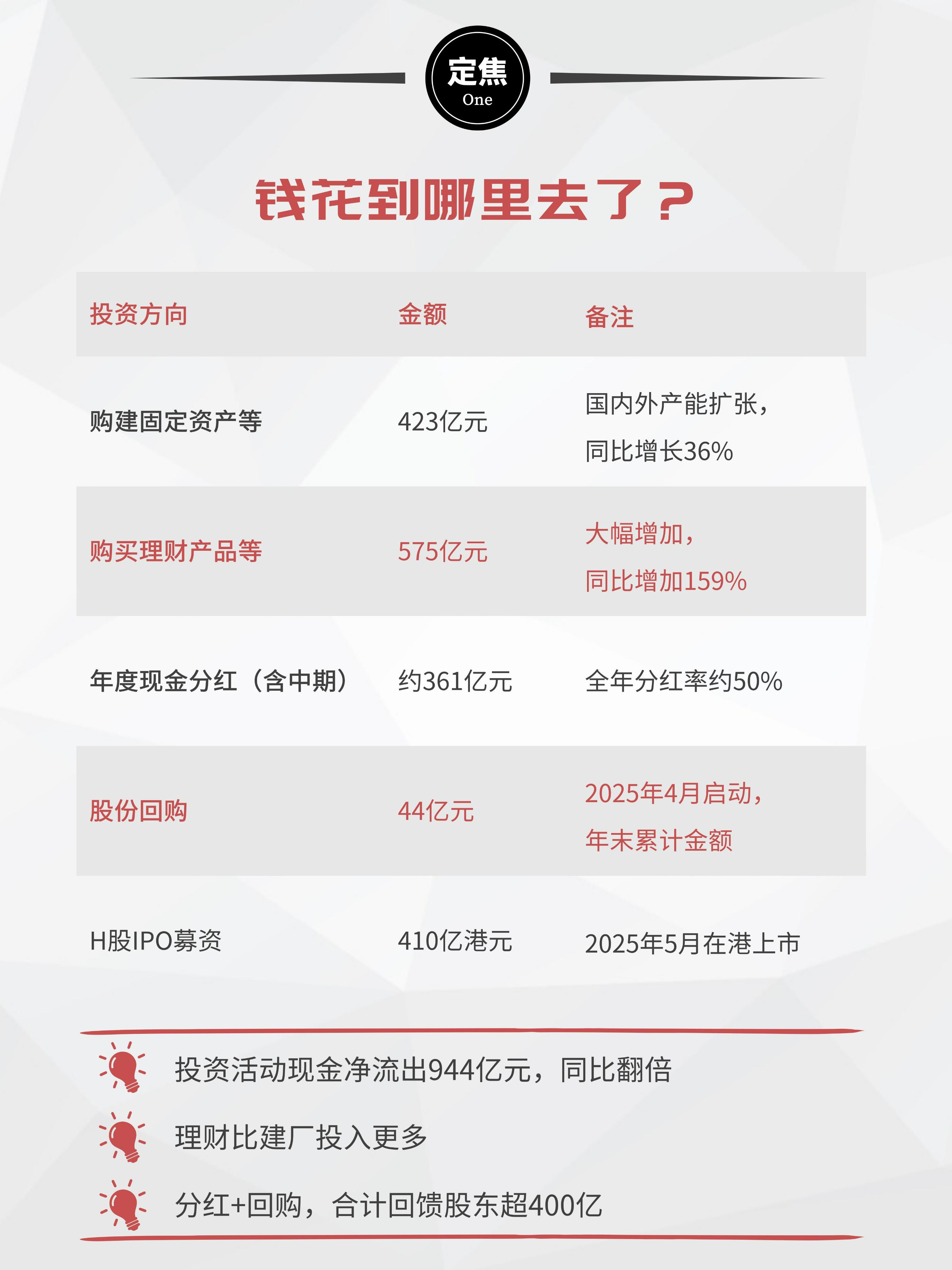 这笔钱的大头,一是产能扩张:购建固定资产等支出423亿元,同比增长36%,国内外多个生产基地同步推进,在建产能321 GWh;二是购买理财产品:投资支出575亿元,同比增长159%。