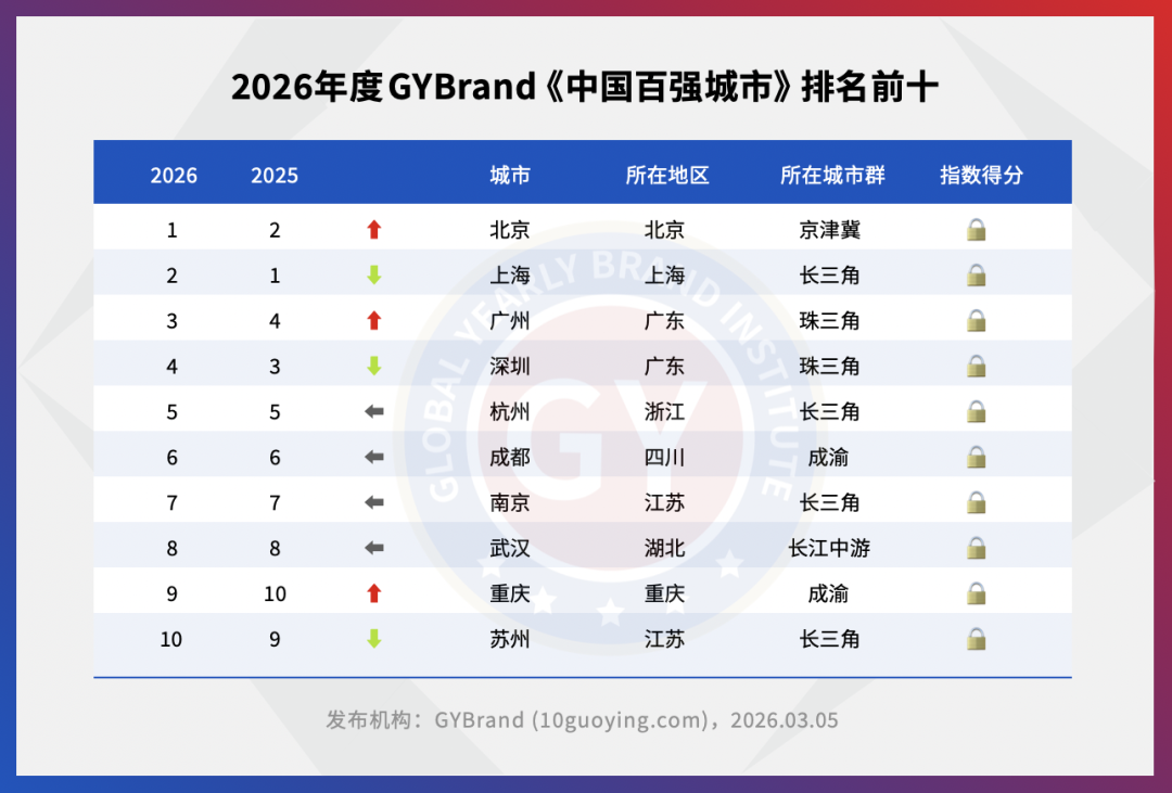 就在广东代表团举行开放团组活动的前一天,城市指数研究机构GYBrand也发布了一个重磅榜单——《2026年度中国百强城市指数》。