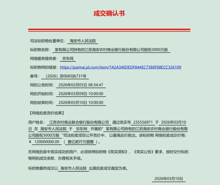 通过上述两次拍卖,江苏农商联合银行共获得海安农商行3900万股股权,累计耗资1.56亿元。股权交割完成后,江苏省苏中建设集团股份有限公司将退出海安农商银行前十大股东名单,而江苏农商联合银行将成为该行第五大股东。