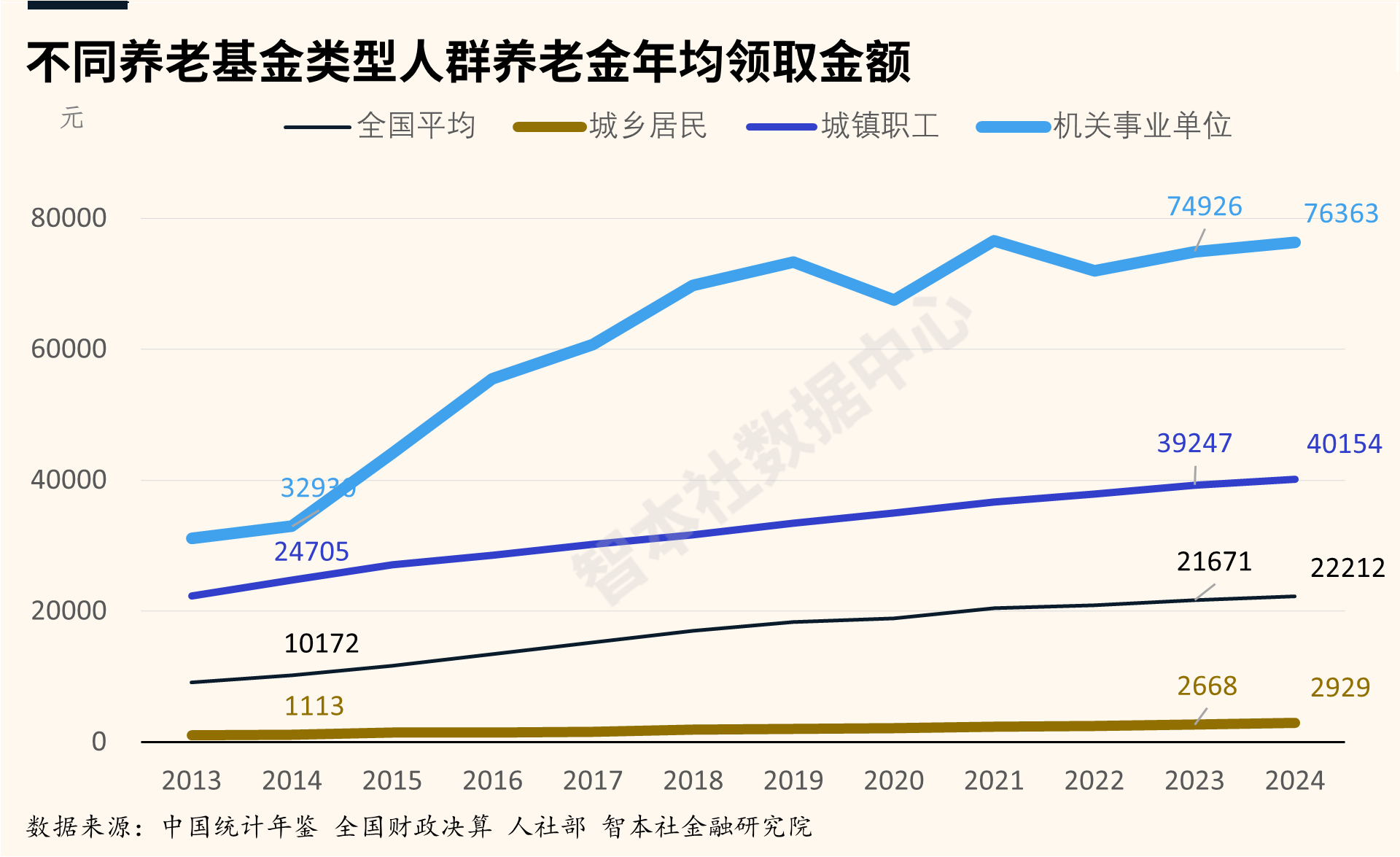 当前社会保障结构性明显:2024年,机关事业单位离退休职工养老金年均领取金额为7.6万元,大概是企业职工养老金4.02万元的2倍,是农村养老金领取金额2929元的26倍。