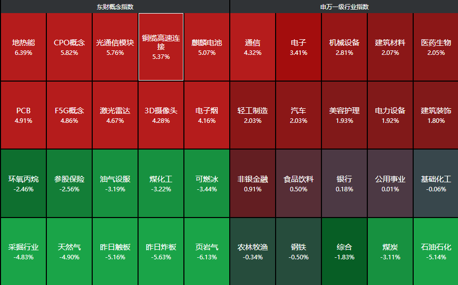 分行业来看,通信、电子、机械设备、建筑材料、医药生物等行业领涨,石油石化、煤炭、综合等行业领跌。