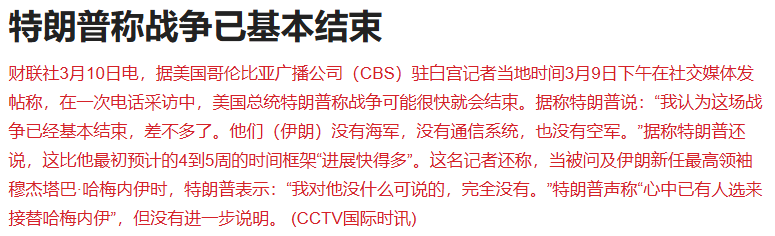 据美国哥伦比亚广播公司(CBS)驻白宫记者当地时间3月9日下午在社交媒体发帖称,在一次电话采访中,美国总统特朗普称战争可能很快就会结束。据称特朗普说:“我认为这场战争已经基本结束,差不多了。特朗普话刚说完,美股尾盘大幅走强。