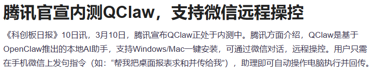 最近“AI龙虾”火爆,继深圳龙岗区、无锡高新区之后,苏州常熟市、合肥高新区也出台政策支持“AI龙虾”,今天腾讯宣布QClaw正处于内测中。