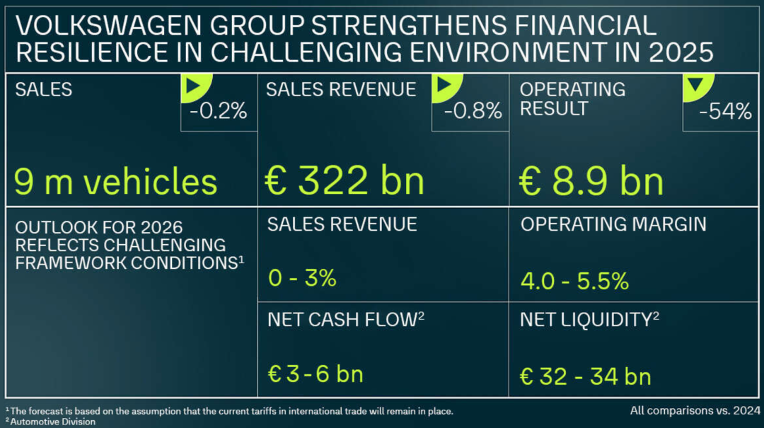 大众方面表示,营业利润下滑主要受美国关税、保时捷产品战略调整费用、货币波动及产品价格结构影响。扣除重组、保时捷战略调整等特殊项目后,集团2025年调整后营业利润率为4.6%;剔除特殊项目及美国关税影响前,营业利润为177亿欧元,对应营业利润率5.5%。