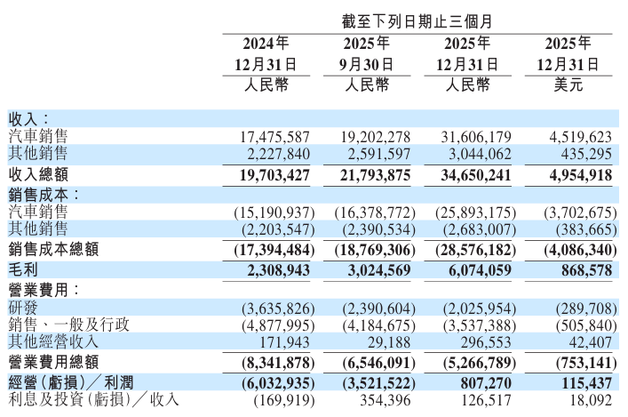 蔚来2025年第四季度的收入总额为346.5亿元,同比增长75.9%,环比增长59%;净利润为2.83亿元,上年同期为净亏损71.12亿元,2025年第三季度为净亏损34.81亿元;经营利润为8.07亿元,上年同期为经营亏损60.33亿元,2025年第三季度的经营亏损为35.22亿元。