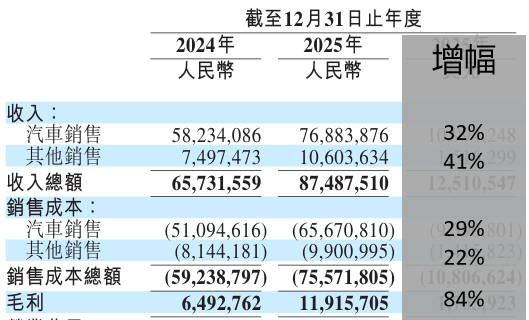 首先是蔚来的收入,全年收入875亿,增长33%,但毛利增长得夸张——
