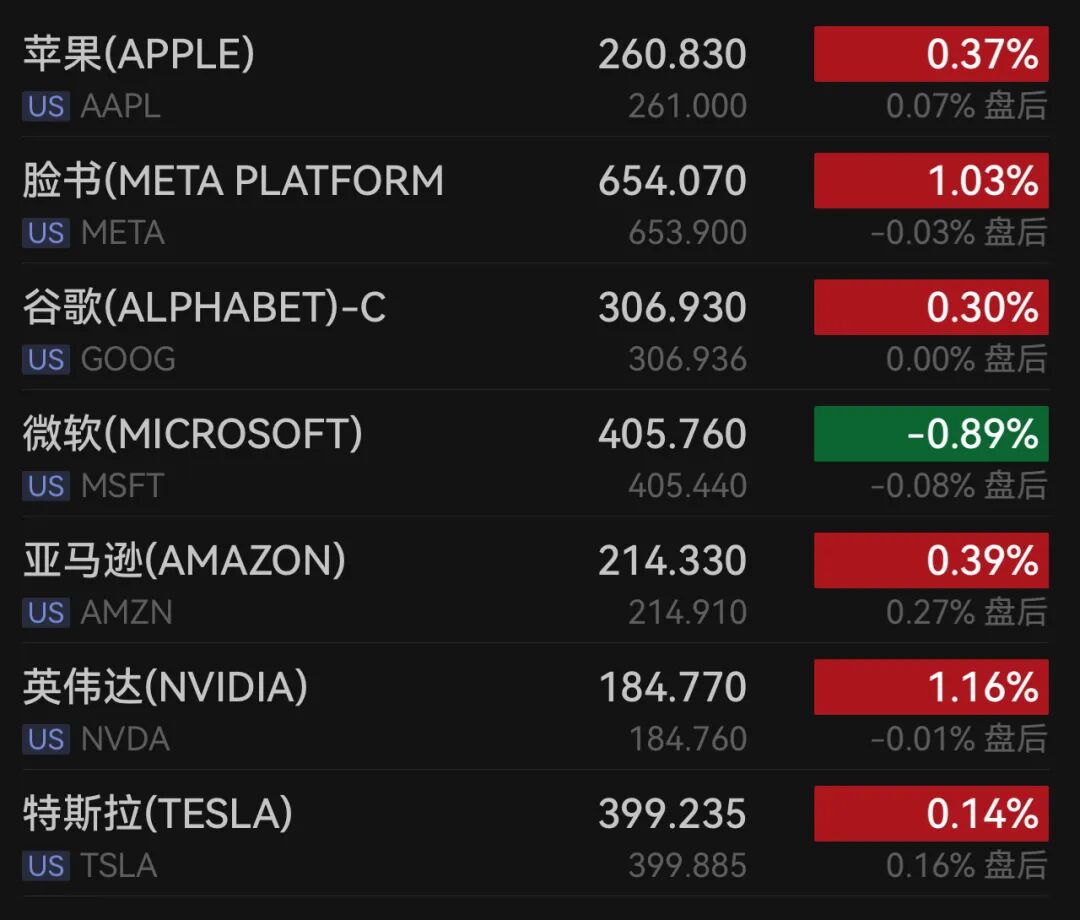 科技巨头涨多跌少,Meta涨1.03%,亚马逊涨0.39%,苹果涨0.37%,超威半导体涨0.27%,谷歌-A涨0.22%,特斯拉涨0.14%。甲骨文跌1.43%,博通跌0.92%,微软跌0.89%。
