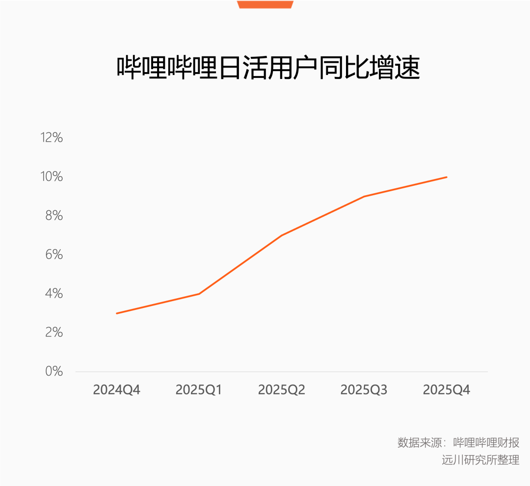 在存量竞争的行业背景之下,B站在2025年第四季度达到8%的月活同比增速,明显高于行业平均水平,日活更是每个季度都在保持增长。